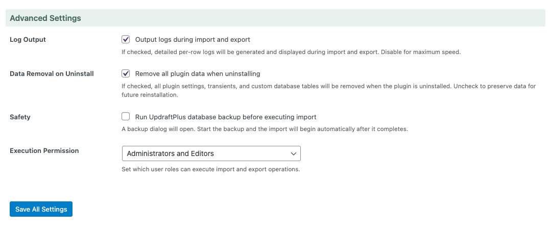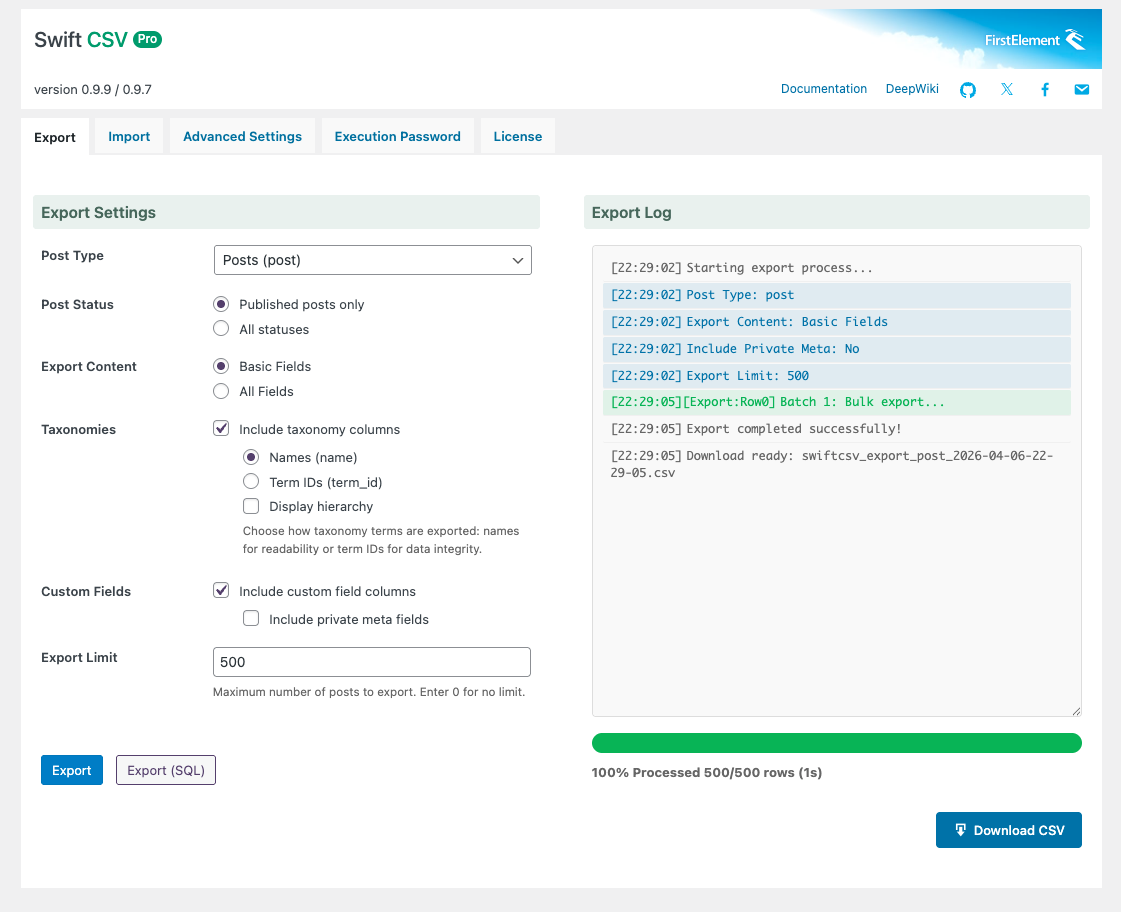 Export a complete record of import and export operations in CSV format. Keep detailed logs of which posts were processed, what data was updated, and whether any errors occurred—available for review at any time. Useful as an audit trail for large-scale data migrations or as investigative material when troubleshooting issues.